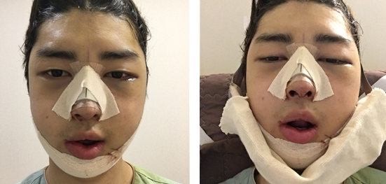 I removed the taping on chin about 1 week before and removed the splint on nose and stitches outside of the face at the clinic 1 week after.