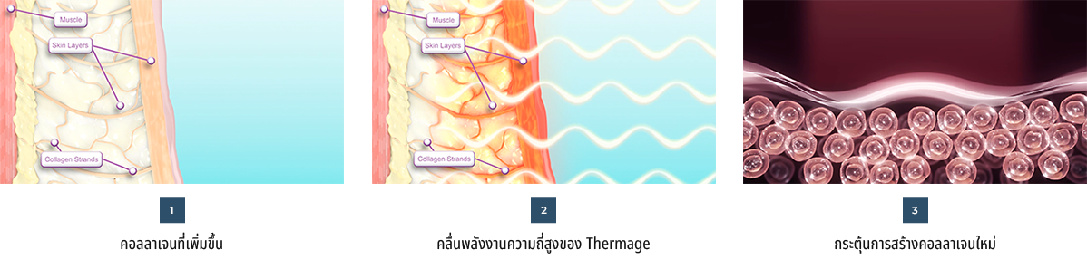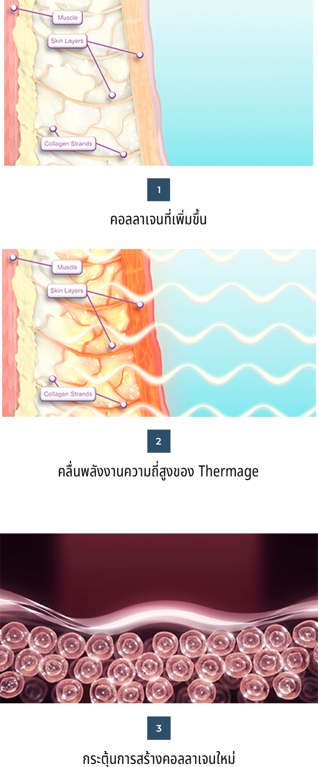 พลังงานความร้อนความถี่สูงแทรกซึม ลึกเข้าไปในผิวหนังชั้นหนังแท้เพื่อ กระตุ้นการสร้างคอลลาเจน